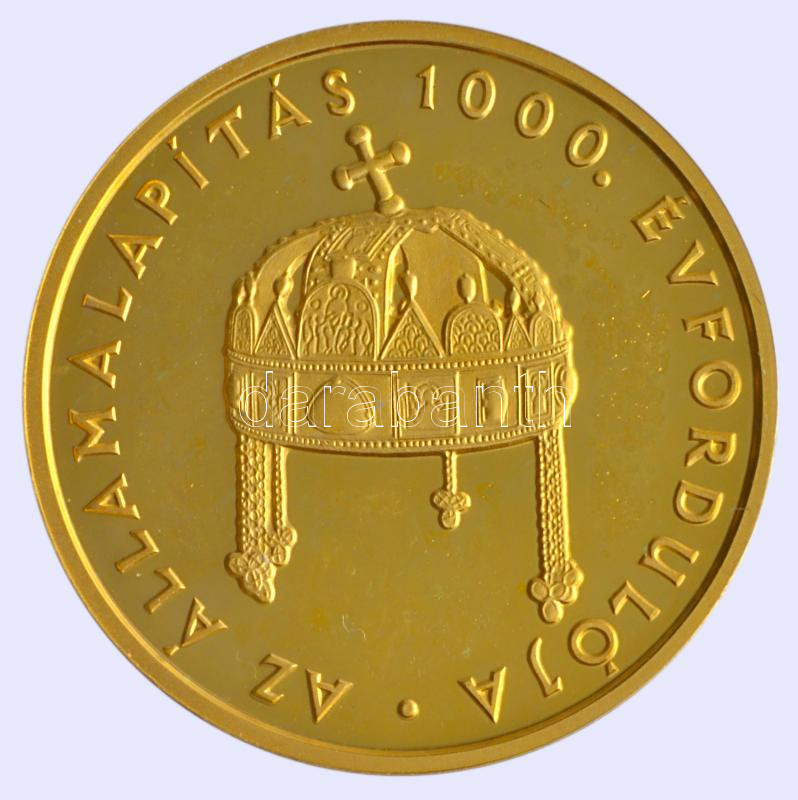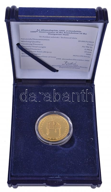 1999. 20.000Ft Au "Államalapítás 1000. évfordulója" (6.982g/0.986/22mm... https://www.darabanth.com/en/189-Online-auction/189.0/Numismatics/Hungarian-and-foreign-gold-coins~300011/1999-20000Ft-Au-Allamalapitas-1000-evforduloja-6982g098622mm-Tanusitvannyal-disz~II704788
