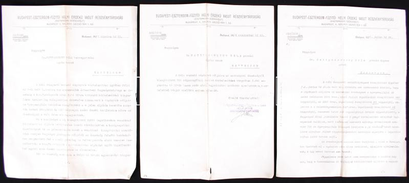 Description: 1926 3 db levél Dr Mattyasovszky Béla hercegprímási ügyésznek címezve a Bp - Esztergom - Fűzítő HÉV épülésének folyamatáiról, fejléces, vízjeles papíron