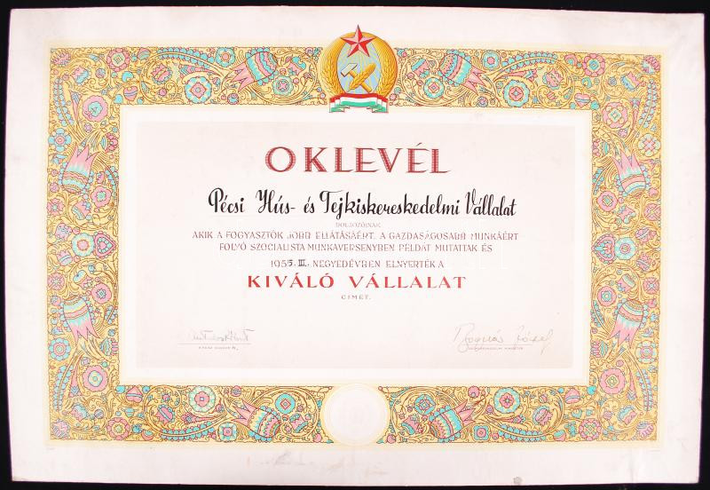 1955 Oklevél - Pécsi Hús-és Tejkiskereskedelmi Vállalat dolgozóinak kiállítva