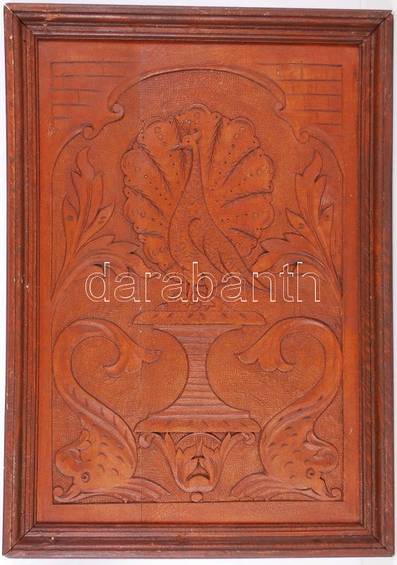 Faragott fali kép, keretben, páva díszítéssel, 48×34 cm