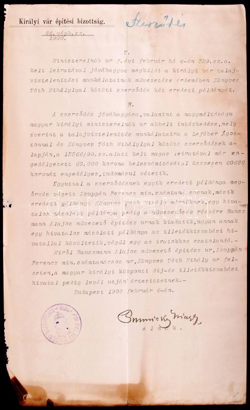 1900 A Podmaniczky Frigyes a Királyi Vár Építési Bizottság elnöke által aláírt hivatalos levél, melyben a vár víztelenítési munkáira szerződik
