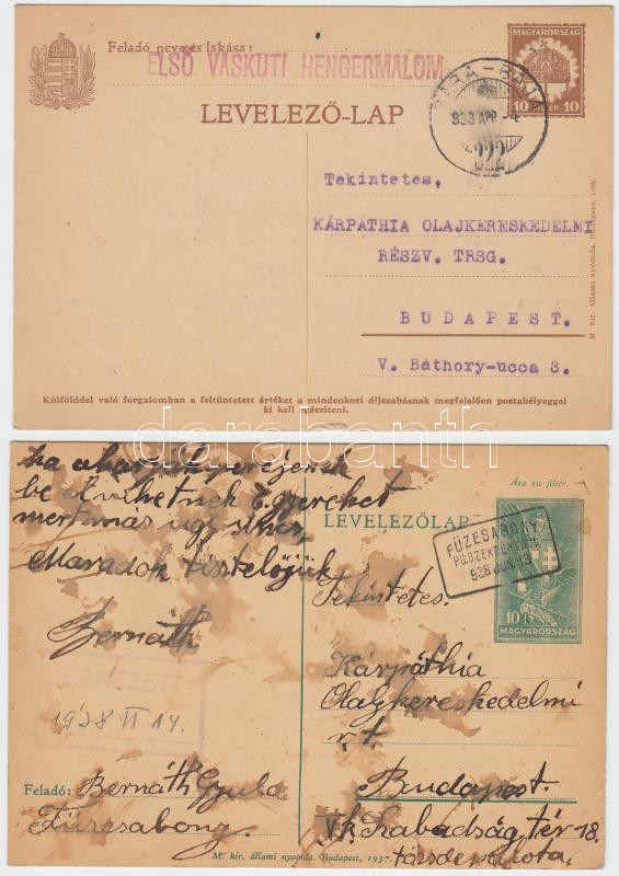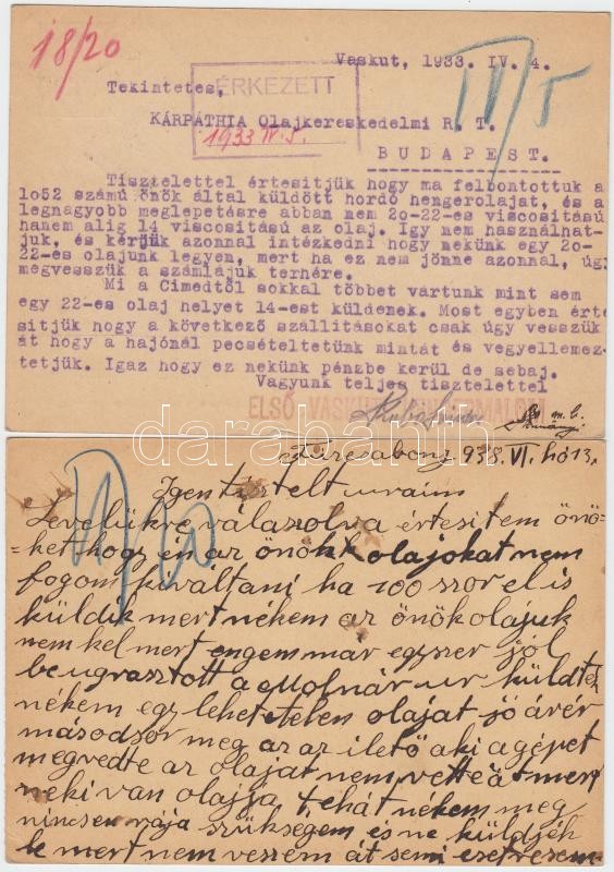 1933/1938 2db, a Kárpáthia Olajkereskedelmi Rt.-nek címzett levelezőlap reklamációkkal