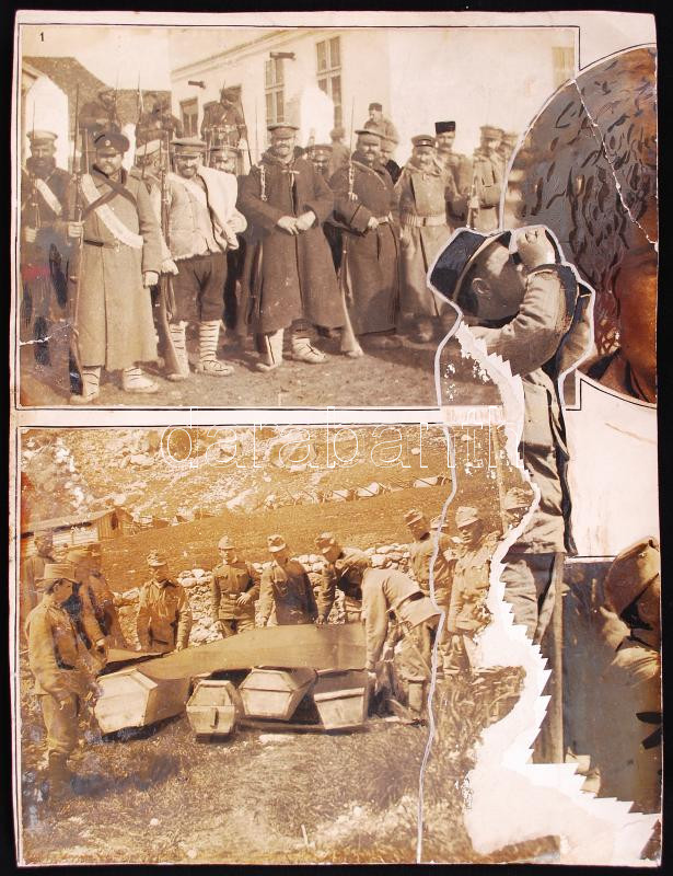 1914-18 felkasírozott képek az I. Vh-ból. Valószínűleg egy újságoldal előkészítése egy nyomda számára, 25x33 cm
