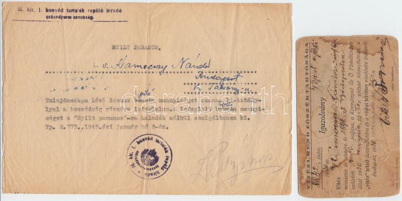 1930 Vitézi jelvény igazolványa + 1945-ös nyílt parancs