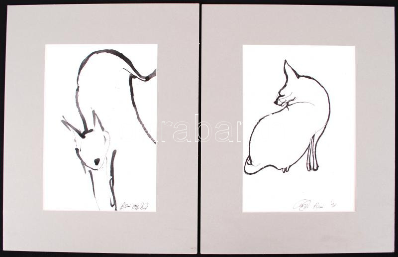 Olvashatatlan jelzéssel: 5 db macska vázlat, tus, paszpartuban, 30×24 ...