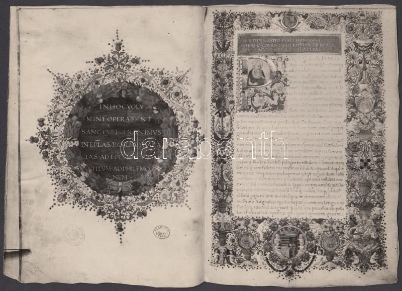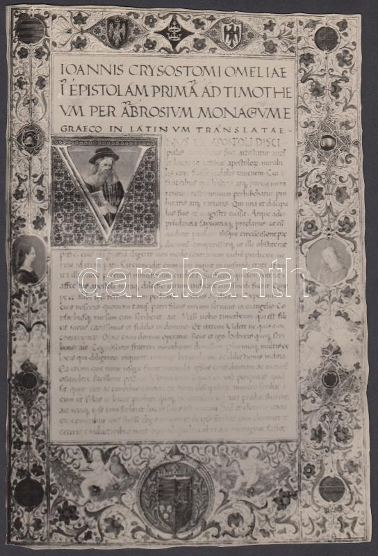 Description: Cca 1940 Kerny István (1879-1963): 2db reprodukciója az Aranyszájú Szent János szentenciái c. Corvin kódexből, amely Mussolini ajándékaként került ismét a magyar állam tulajdonába. Hátoldalukon rövid leírás, fotók kézzel körbevágva, jelzett, 21x14 cm