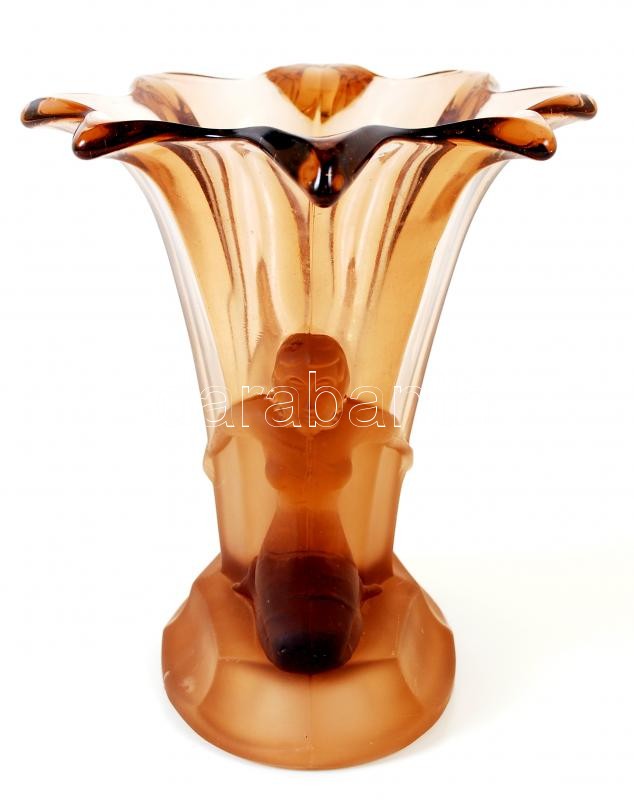 Waltherglas 'Windor' váza, rózsaszín formába öntött üveg, alján apró csorbával, jelzett, 27x19 cm, m: 21cm / Art-deco August Walther & Sohne, 'Windsor' vase, pink glass, small chipped