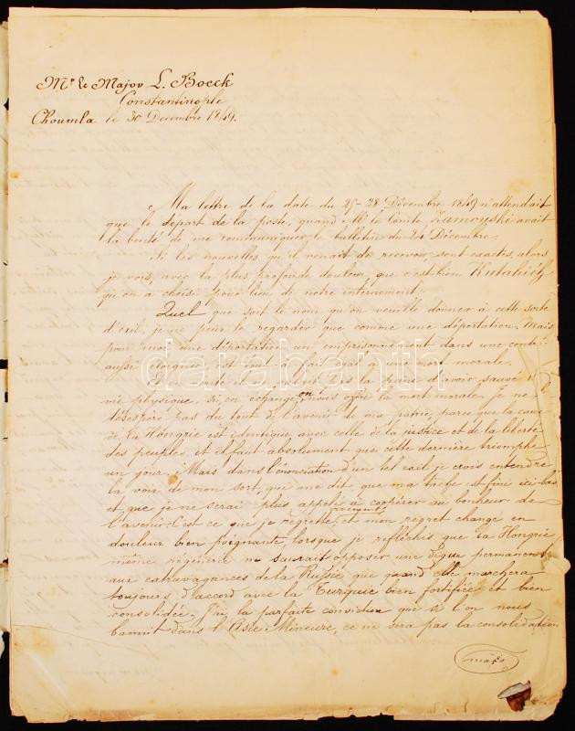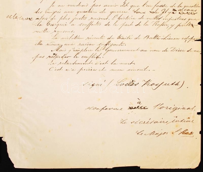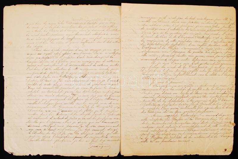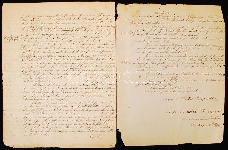 1849. december 30. Kossuth Lajos 16 oldalas francia nyelvű manifesztuma nézeteiről, politikai meglátásairól. Leopold Boeck (1826-1896) ezredes, egyetemi tanár, ebben az időben Bem és Kossuth titkára keze írásával. Kossuth Lajos saját kezű javításaival és aláírásával. Konstantinápolyban lejegyezve. / 1849 Luis Kossuth's 16 page manifestum in French, written by professor Leopold Boeck (1826-1896) his secretary, later American professor. Signed and corrected by Kossuth in Constantinople