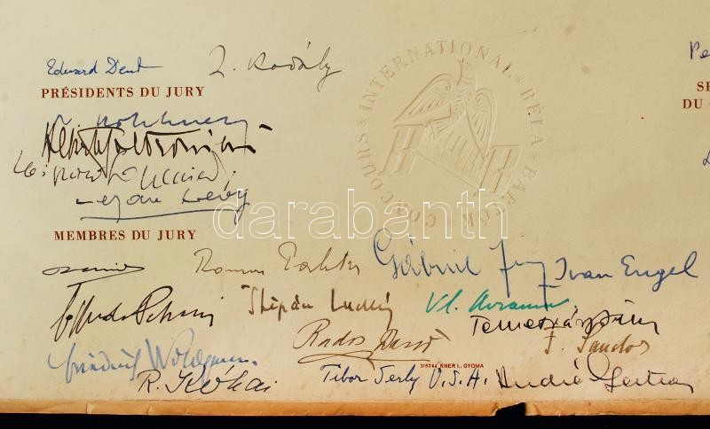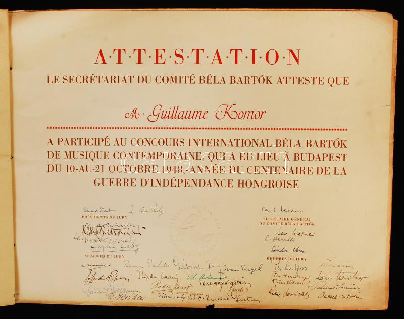 1948 Oklevél az 1948-as Nemzetközi Bartók Béla Találkozóról Komor Vilm... https://www.darabanth.com/en/19-Major-auction/19.1/Art-and-collectibles/Historical-documents-manuscripts~6522/1948-Oklevel-az-1948-as-Nemzetkozi-Bartok-Bela-Talalkozorol-Komor-Vilmos-karmester-reszere~II926378