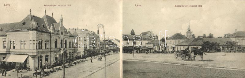 Léva, Kossuth tér 1902-ben és 1910-ben; Nyitrai és Társa Rt. kiadása / Kossuth square then and now; folding card (gluemark on backside)