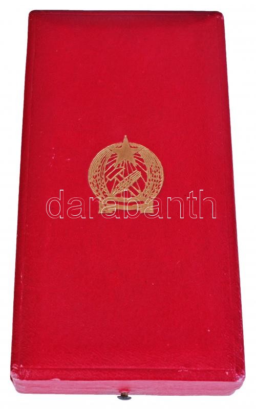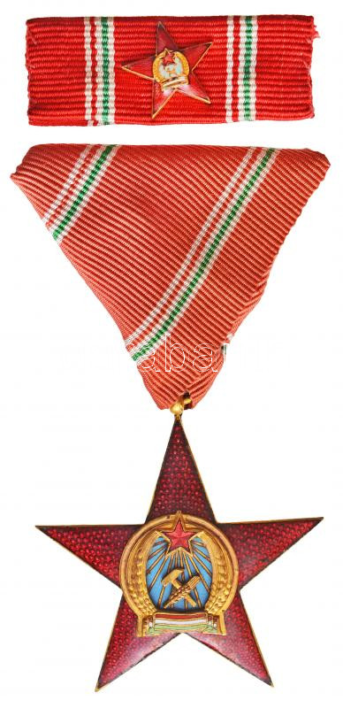 Description: 1949. "A Magyar Népköztársasági Érdemérem arany fokozata" zománcozott aranyozott bronz kitüntetés mellszalaggal, szalagsávval és miniatűrrel adományozói tokban T:1-