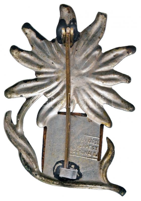 Description: ~1930. "Magyar Turista Egyesület" hivatalos jelvénye, zománcozott fém (havasi gyopár benne körben MTE, alul kapcsolódik hozzá a pajzs a kettős kereszttel) "Boczan Károly, Budapest Csokonai u." gyártói jelzéssel (40,5x30mm) T:1-