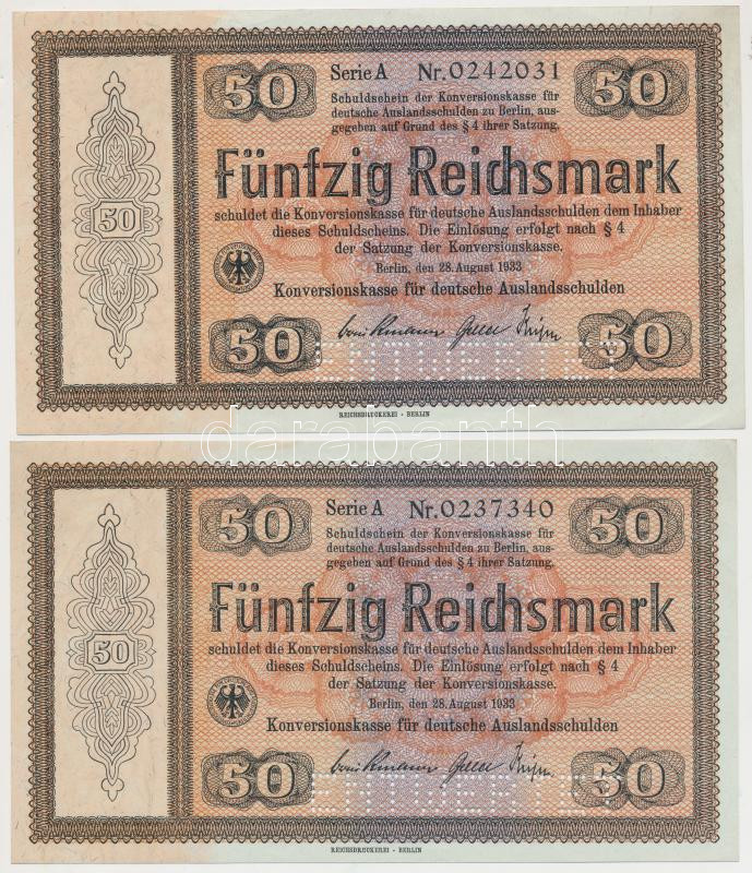German Third Reich 1933. 50 Reichsmark with "ENTWERTET" perforation (2x) C:AU,XF