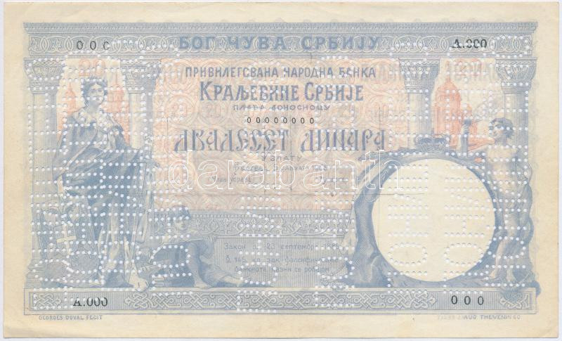 Description: Szerbia 1905. 20D "A.000 000" sorozat és sorszámmal, ismeretlen cirill "PONISTENO" (érvénytelenítve) perforációkkal T:II