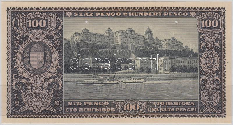 Hungary 1926. 100 Pengő only back printers proof with "SPECIMEN" perforation, cancelled by holes, with unknown watermark C:XF gluemarked on the backside, pinholes
