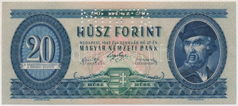 Hungary 1947. 20 Forint with "C 000 - 000186" serial number and with "MINTA" (SPECIMEN) perforation C:XF