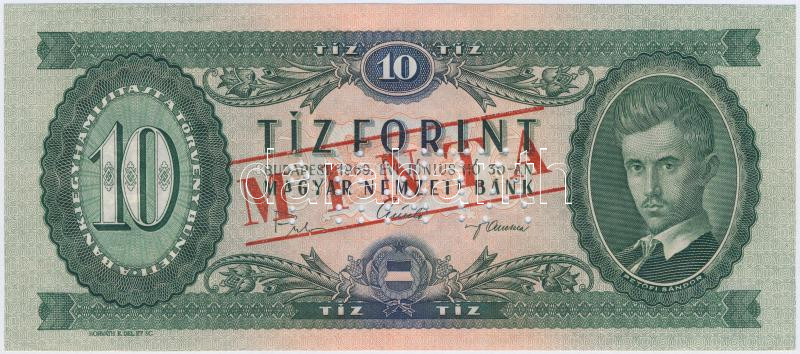 Hungary 1969. 10 Forint with "A 000 - 001336" serial number and with red "MINTA" (SPECIMEN) overprint and perforation C:UNC