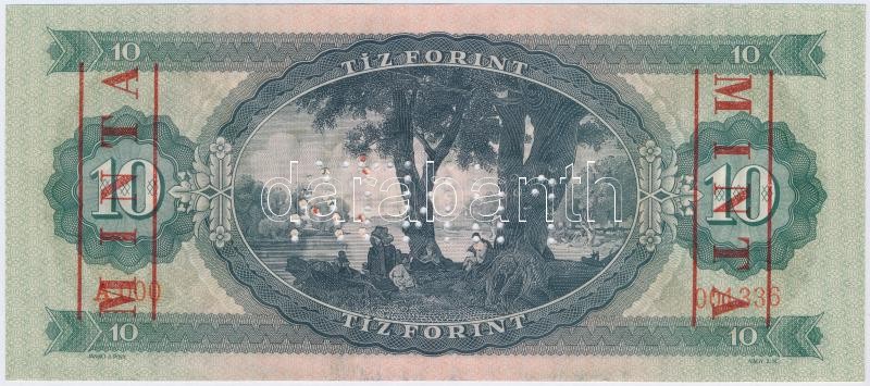 1969. 10Ft "A 000 - 001336" sorozat és sorszámmal, piros "MINTA" felül... https://www.darabanth.com/en/19-Major-auction/19.1/Numismatics/Hungarian-Banknotes~6497/1969-10Ft-A-000--001336-sorozat-es-sorszammal-piros-MINTA-felulnyomassal-es-perforacio~II931706