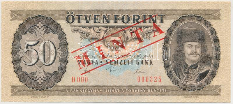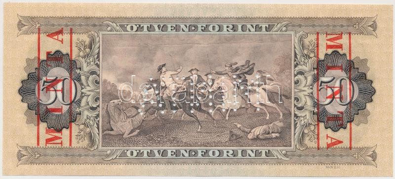 1980. 50Ft "D 000 000325" sorozat és sorszámmal, piros "MINTA" felülny... https://www.darabanth.com/en/19-Major-auction/19.1/Numismatics/Hungarian-Banknotes~6497/1980-50Ft-D-000-000325-sorozat-es-sorszammal-piros-MINTA-felulnyomassal-es-perforaciova~II928741