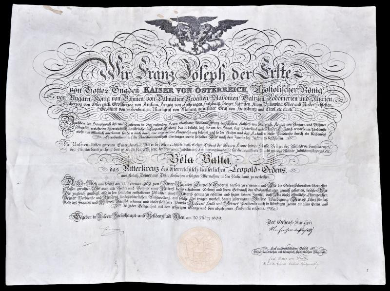 Hungary 1909. Awarding document of the "Order of Leopold Knight's Cross" decoration for Béla Balta, with embossed stamp and autograph signature of Franz Joseph C:folded, wet damage