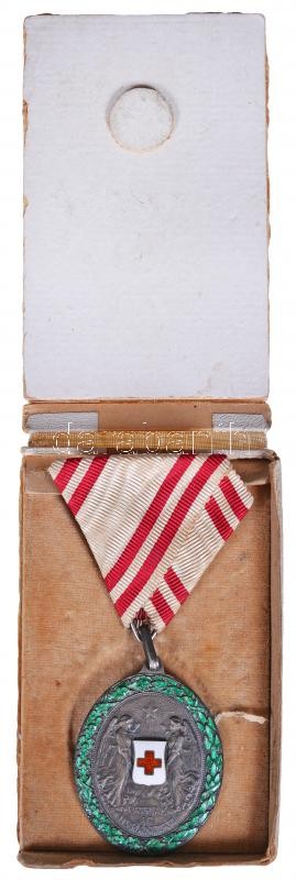 Description: 1914. "A Vörös Kereszt Ezüst Díszérme hadidíszítménnyel" fémjelzetlen zománcozott ezüst kitüntetés mellszalagon, sérült adományozói tokban T:2