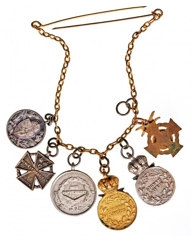 1916-1918. "A Katonai Érdemkereszt III. Osztálya hadidíszítménnyel és kardokkal" + 1914-1916. "Ezüst Katonai Érdemérem a katonai érdemkereszt szalagján kardokkal" + "Bronz Katonai Érdemérem a katonai érdemkereszt szalagján, kardokkal" + 1914-. "I. osztályú Ezüst Vitézségi Érem" + 1916. "Károly Csapatkereszt" + 1929. "Magyar Háborús Emlékérem kardokkal, sisakkal" kitüntetések miniatűrjei frakkláncon T:1-,2