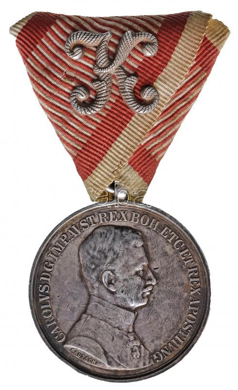 Description: 1917. "Tiszti Ezüst Vitézségi Érem" Ag kitüntetés peremen "A" jelzéssel, mellszalagon "K" betűvel. Szign.:KAUTSCH (40mm) T:2- Csak 100 adományozás!