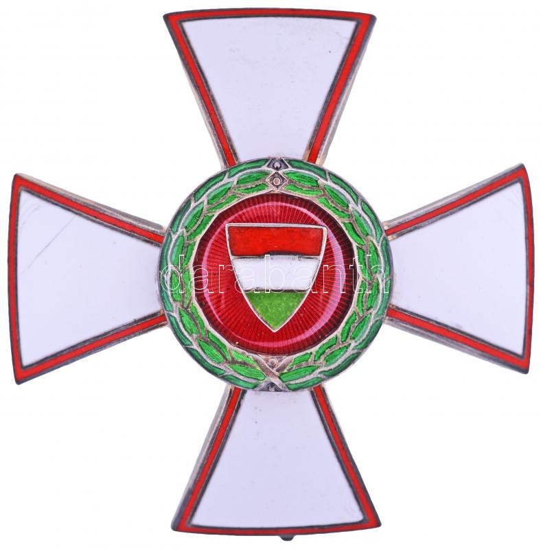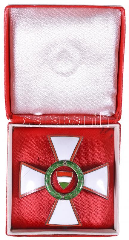 Hungary 1946. "Order of Merit of the Hungarian Republic, Officer's Cross" hallmarked, enamelled, gilt silver decoration with vertical pin in not original case C:XF small enamel errors, only 403 awarding!