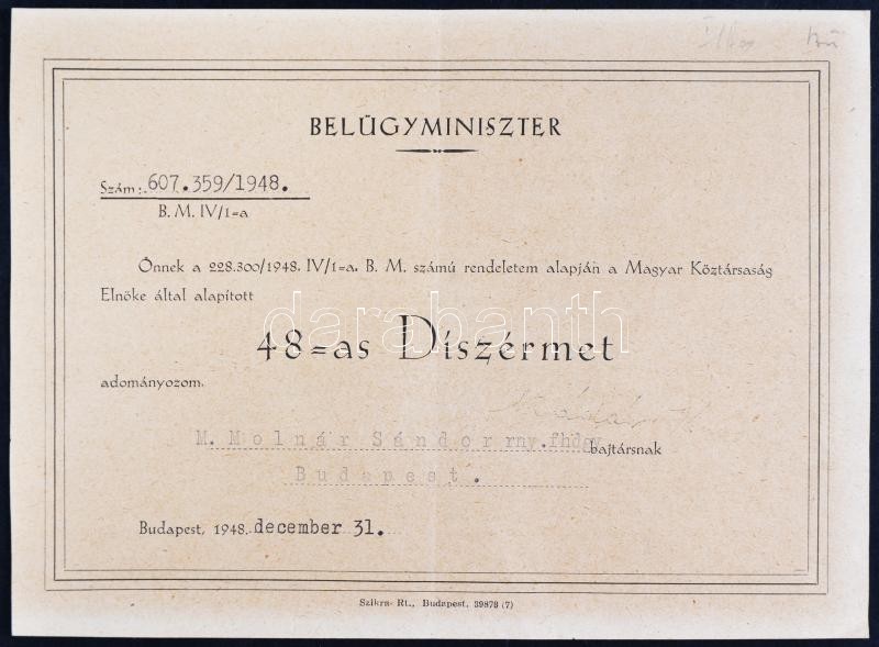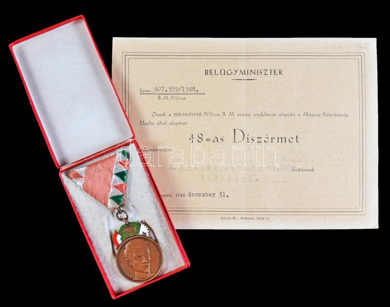 1948. "48-as Díszérem" zománcozott Br kitüntetés mellszalaggal, adomán... https://www.darabanth.com/en/19-Major-auction/19.1/Numismatics/Military~6513/1948-48-as-Diszerem-zomancozott-Br-kituntetes-mellszalaggal-adomanyozoi-okirattal-eredet~II900850