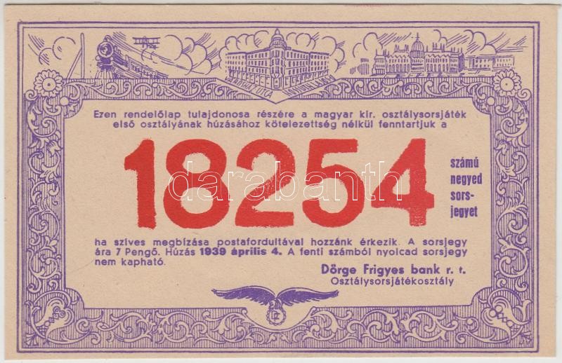 Budapest 1939. "Dörge Frigyes Bank R.T." a "Magyar Királyi Osztálysors... https://www.darabanth.com/en/19-Major-auction/19.1/Numismatics/Shares-tickets-emergency-coins-and-notes~6540/Budapest-1939-Dorge-Frigyes-Bank-RT-a-Magyar-Kiralyi-Osztalysorsjatek-sorsjegye-es-rend~II930788