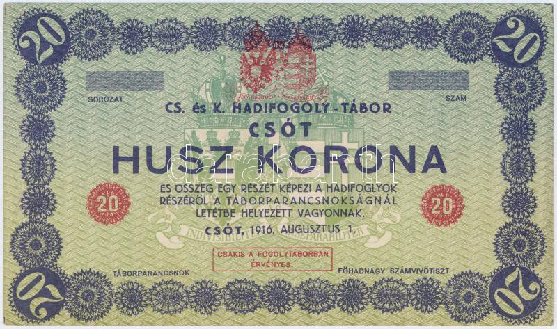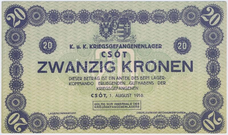 Csót / hadifogolytábor 1916.08.01. 20K számozás és aláírás nélkül T:I-... https://www.darabanth.com/en/19-Major-auction/19.1/Numismatics/Shares-tickets-emergency-coins-and-notes~6540/Csot-hadifogolytabor-19160801-20K-szamozas-es-alairas-nelkul-TI-kis-sarokkopasok~II932247