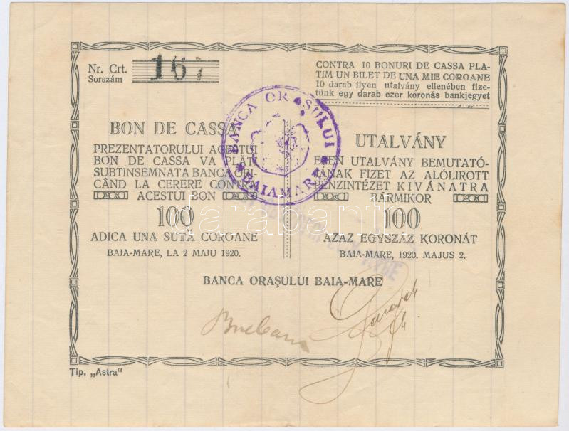 https://www.darabanth.com/en/19-Major-auction/19.1/Numismatics/Shares-tickets-emergency-coins-and-notes~6540/Nagybanya-19200502-100K-Utalvany-vizjeles-papiron-belyegzesekkel-TII-apro-szakadasok~II932685