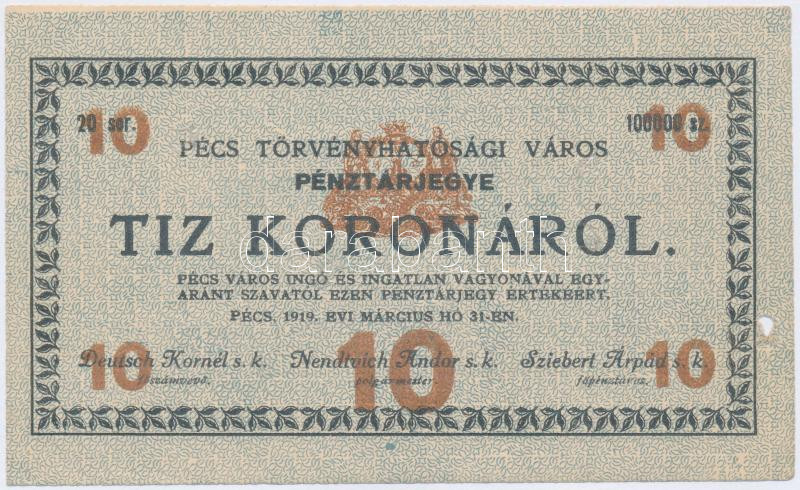 Hungary / Pécs 31.03.1919. 10 Korona "Receipt" printers proof, blue basic print, brown face value and coat of arms, Árpád Sziebert instead of Antal Szieberth, cancelled by holes C:AU (unfolded)