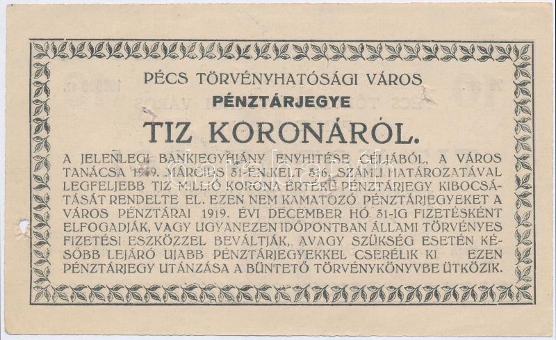 Pécs 1919.03.31. 10K "Pénztárjegy" próbanyomat, kék alapnyomat értékjelzés és címer barna, Szieberth Antal helyett Sziebert Árpád, lyukasztásokkal érvénytelenítve T:I- (hajtatlan)