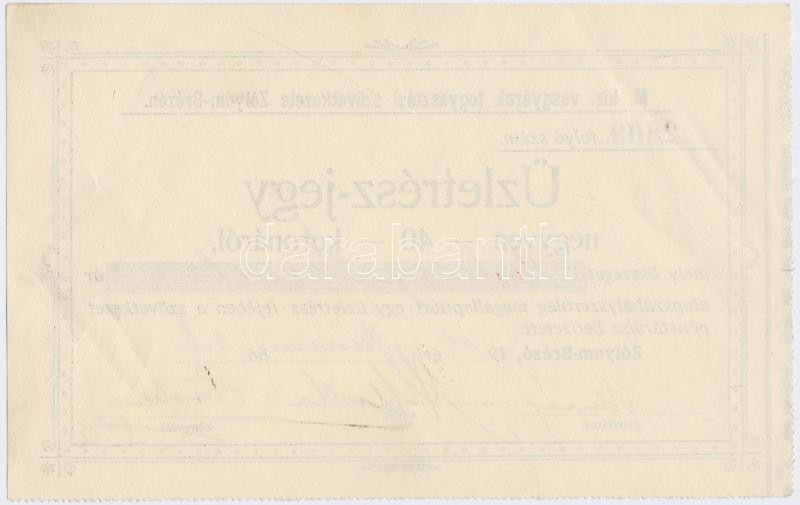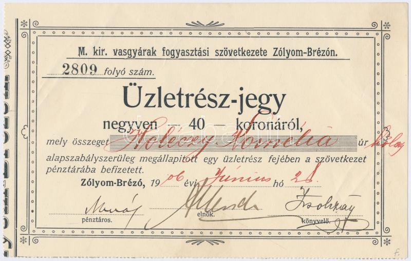 Zólyombrézó 1906. "Magyar Királyi Vasgyárak Fogyasztási Szövetkezete" ... https://www.darabanth.com/en/19-Major-auction/19.1/Numismatics/Shares-tickets-emergency-coins-and-notes~6540/Zolyombrezo-1906-Magyar-Kiralyi-Vasgyarak-Fogyasztasi-Szovetkezete-uzletreszjegy-40K-ro~II933043