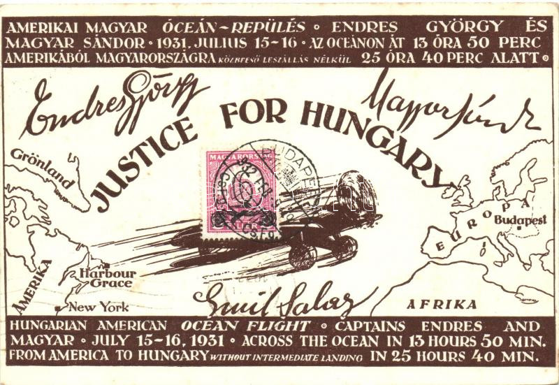 1931 Justice for Hungary, Endresz György és Wilczek Sándor óceánrepülése; kiadja a Magyar Nemzeti Szövetség / transatlantic flight, irredenta