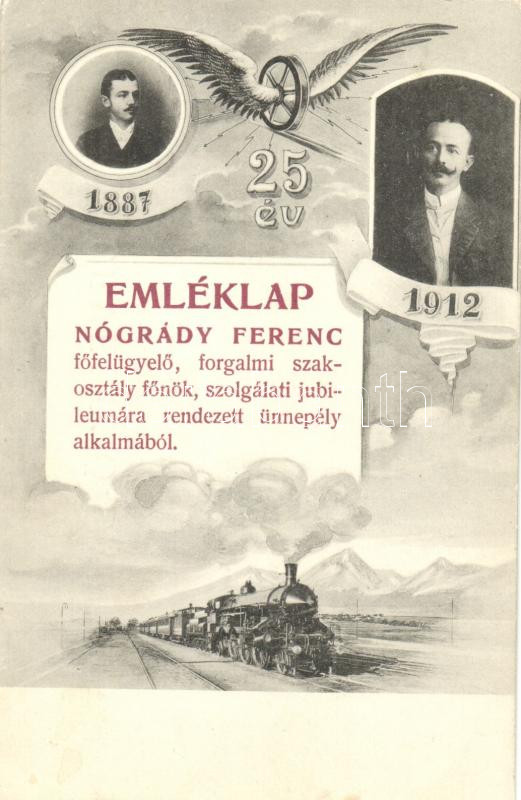 1912 Emléklap Nógrády Ferenc főfelügyelő, forgalmi szakosztály főnök, ... https://www.darabanth.com/en/19-Major-auction/19.1/Thematic-postcards/Railway~6666/1912-Emleklap-Nogrady-Ferenc-fofelugyelo-forgalmi-szakosztaly-fonok-szolgalati-jubileumC3~II942211