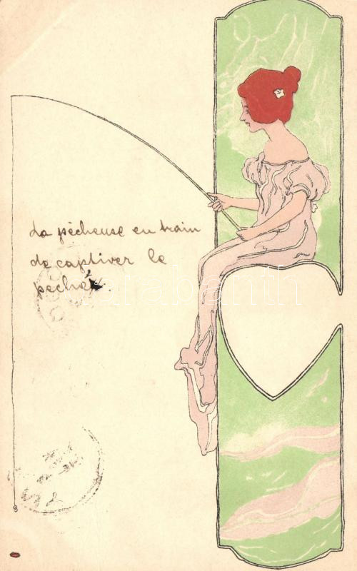 1899 Fishing lady; Raphael Kirchner style Art Nouveau postcard