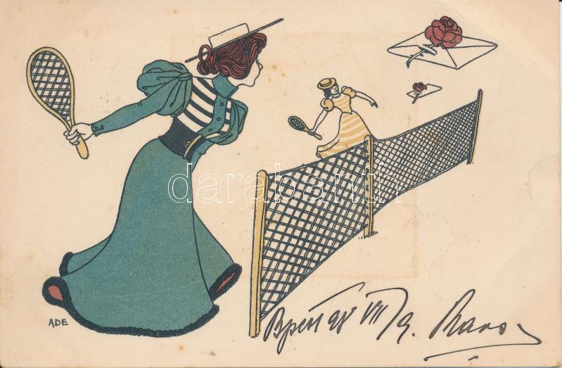 1898 Playing tennis, letters with rose, humour s: ADE (fl)