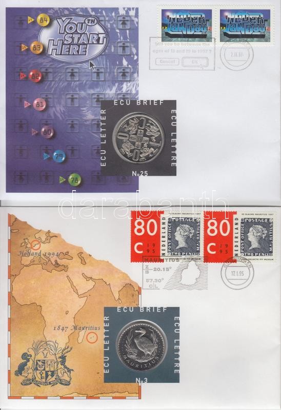 6db klf "ECU" érmés boríték alkalmi bélyegzős bélyegpárral, hátoldali ...