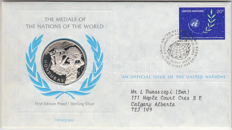 Description: ENSZ 1982. "A Világ nemzeteinek emlékérmei - Honduras" Ag emlékérem (15g/0.925/32mm) megcímzett érmés borítékon elsőnapi bélyegzős bélyeggel, hátoldali tanúsítvánnyal, ismertetőkkel T:PP