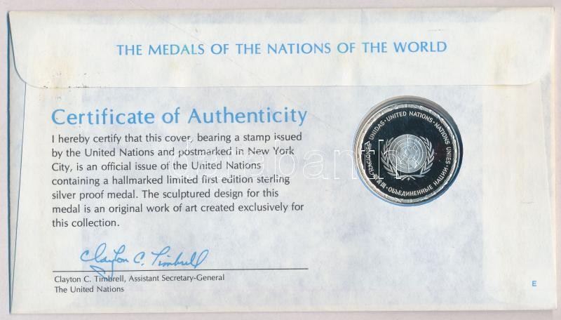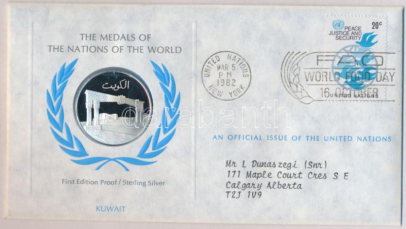 Description: ENSZ 1982. "A Világ nemzeteinek emlékérmei - Kuvait" Ag emlékérem (15g/0.925/32mm) megcímzett érmés borítékon elsőnapi bélyegzős bélyeggel, hátoldali tanúsítvánnyal, ismertetőkkel T:PP
