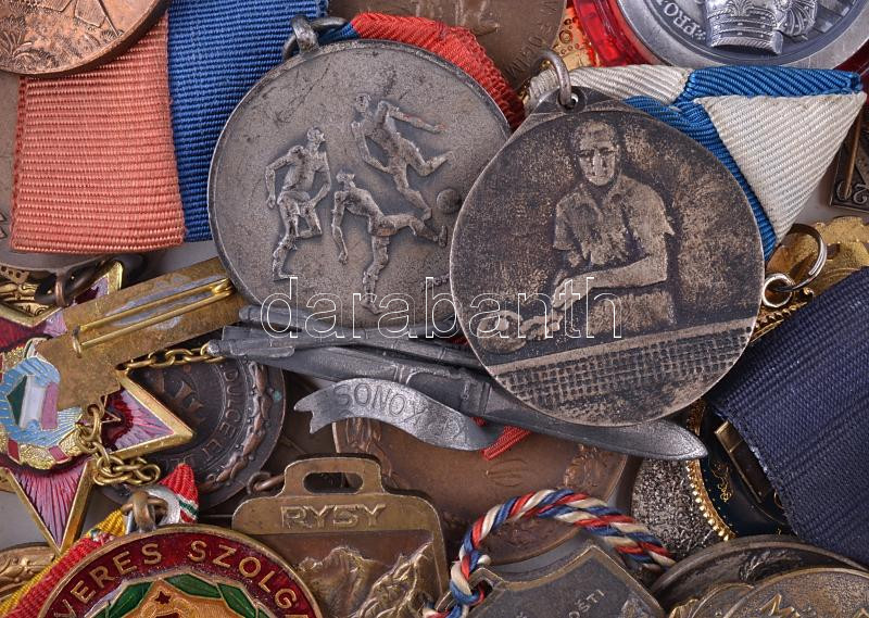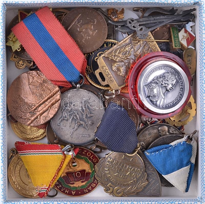 Kis doboznyi vegyes kitüntetés és emlékérem tétel, közte szocialista kitüntetések, bronz sportérmek, külföldi emlékérmek, több szalaggal T:vegyes