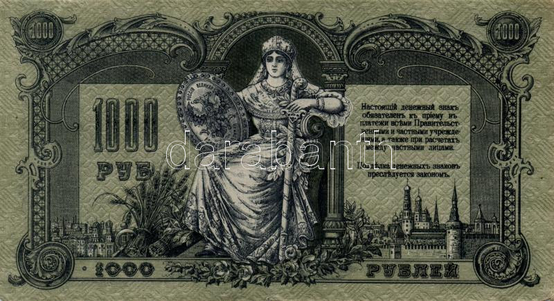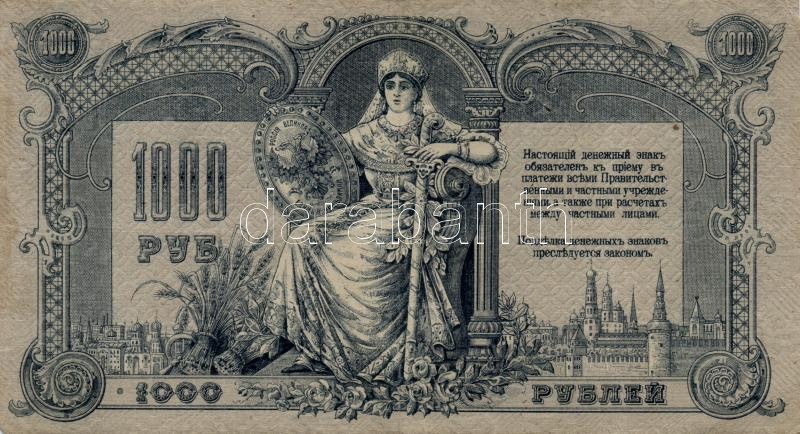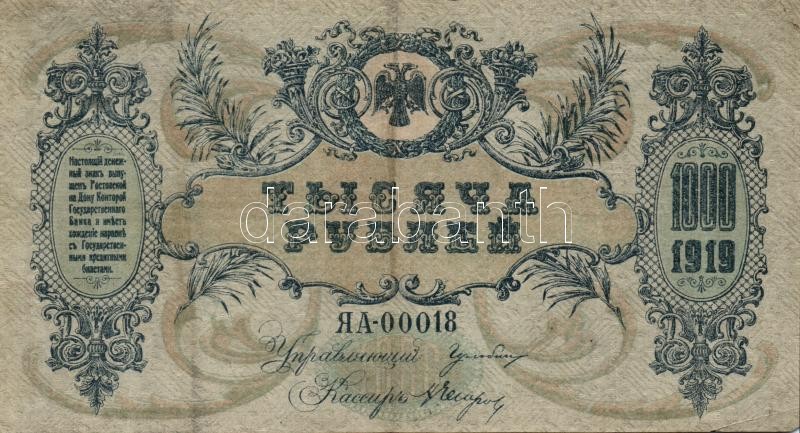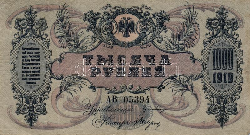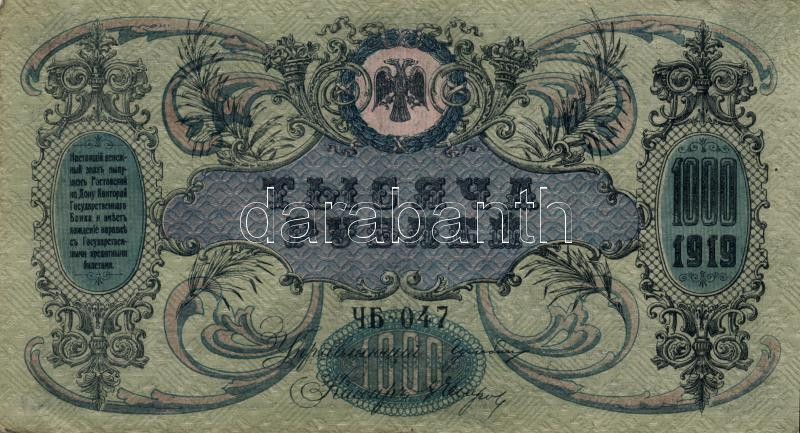 Orosz Polgárháború/Dél-Oroszország 1919. 1000R klf vízjellel T:II-,III... https://www.darabanth.com/en/190-Online-auction/190.0/Numismatics/Foreign-banknotes~600011/Orosz-PolgarhaboruDel-Oroszorszag-1919-1000R-klf-vizjellel-TII-III-3Cbr3ERussian-civil-war~II712207