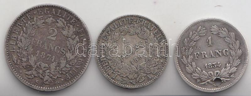 Franciaország 1834. 1Fr Ag ly. + 1895. 1Fr Ag + 1871. 2Fr Ag T:3