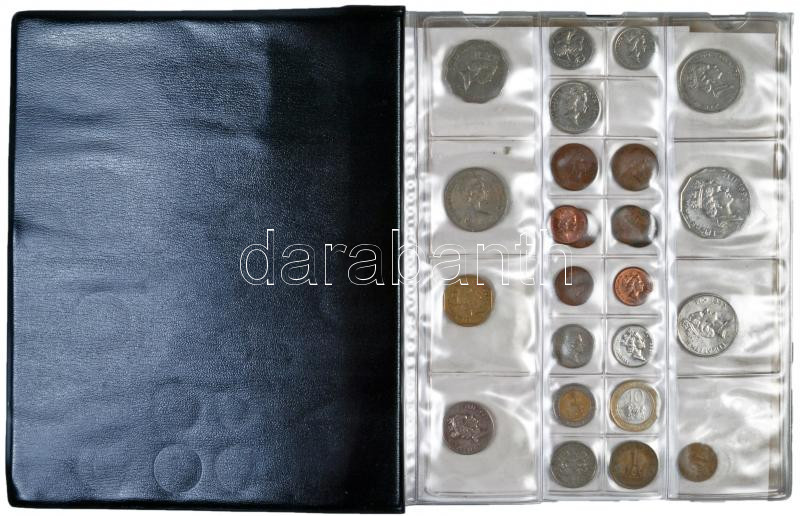 Vegyes fémpénzek gyűrűs éremtartó albumba rendezve, közel 100db érme Nagy-Britannia, Francia Polinézia, Chile, Egyesült Államok pénzeiből T:vegyes