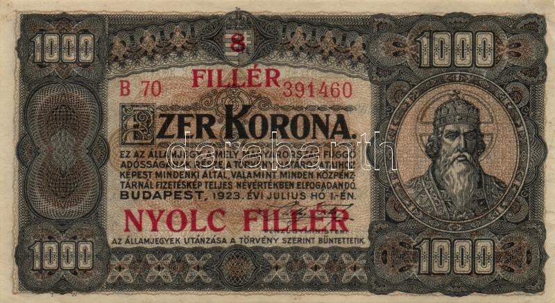 1923. 1000K T.W. nyomdahely jelöléssel és "8 FILLÉR - NYOLC FILLÉR" fe...
