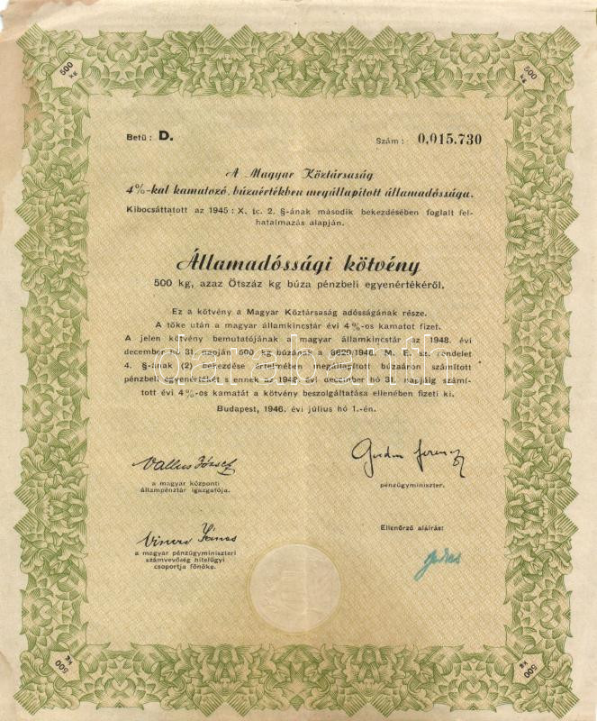 Budapest 1946. "A Magyar Köztársaság 4%-kal kamatozó, búzaértékben meg... https://www.darabanth.com/en/190-Online-auction/190.0/Numismatics/Shares-and-Tickets~600005/Budapest-1946-A-Magyar-Koztarsasag-425-kal-kamatozo-buzaertekben-megallapitott-allamado~II677385