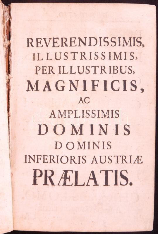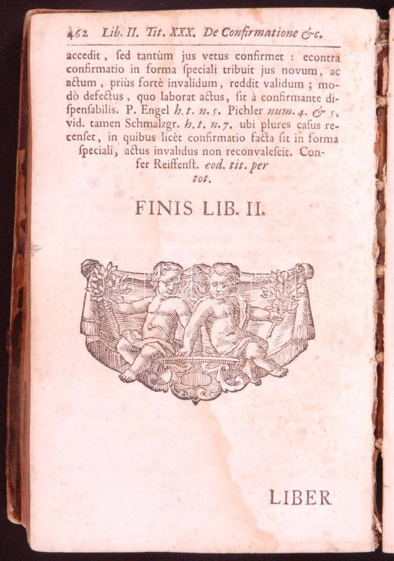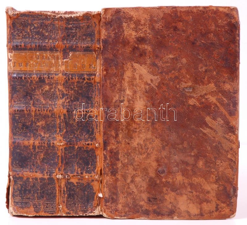 Greneck, Adam Joseph: Examen juris canonici juxta V. libros decretalium... praeside praenobili, spectabili, ac consultissimo viro - - ...a R. ac relig. patre Gerardo Kolb...publico examini expositum. Viennae, [1728], Georgii Lehmanni. Korabeli, megkopott aranyozású, bordázott gerincű egészbőr kötésben, festett lapszélekkel, kétszínnyomású címlappal és zádódíszekkel. Körbevágott példány, 1 levél hiányzik (463-464), a kötés körben kopottas, egyébként jó állapotú /
