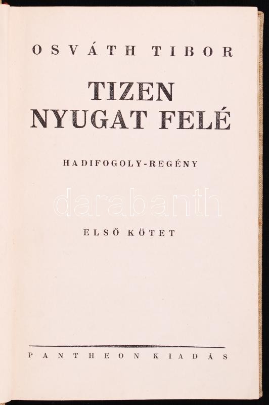 Frontregények: Osváth Tibor: Tízen Nyugat felé.(Hadifogoly-regény) Első kötet, Pantheon, Bp. Egészvászon kötésben.